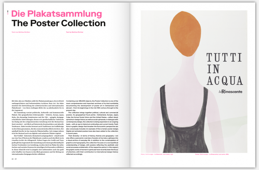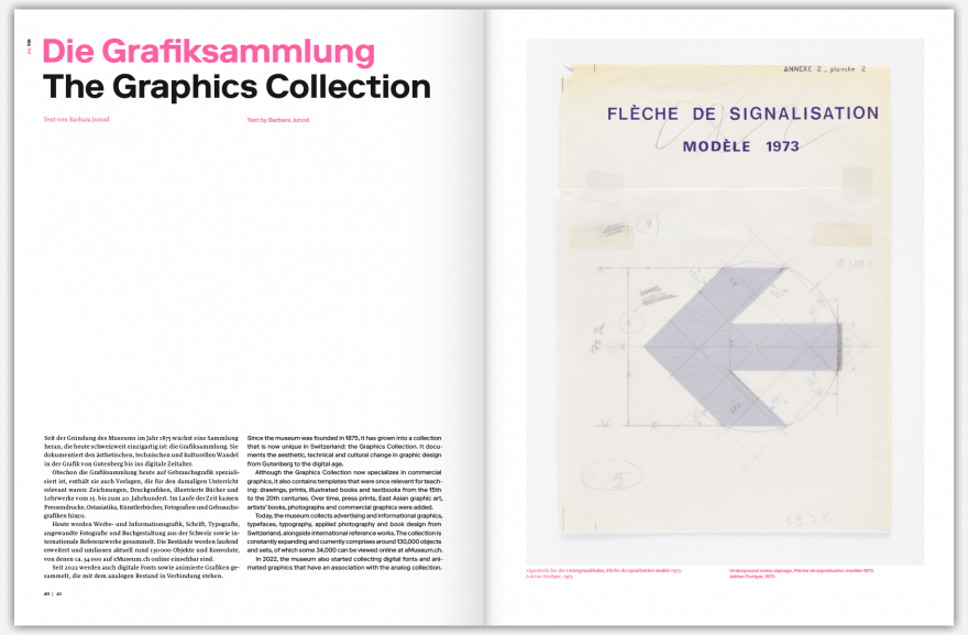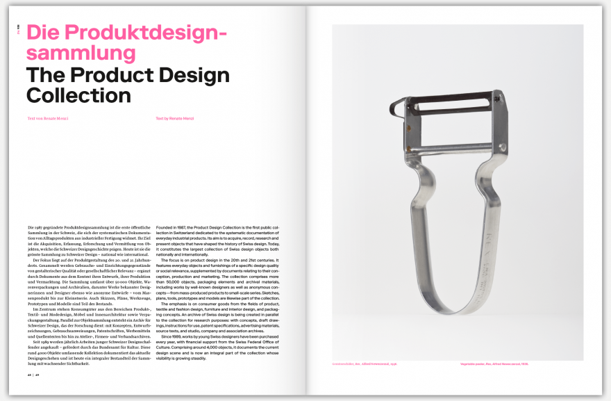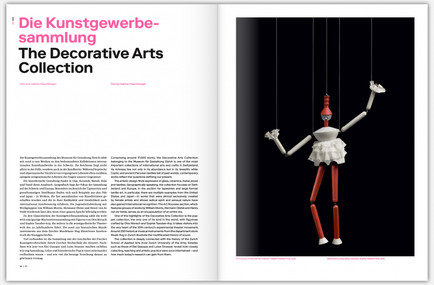 This edition of Du is all about design. The font, image, design and language of this issue are a symbiosis of our cooperation with the Museum für Gestaltung Zürich. Even the 80-year-old Du logo has been specially adapted and appears in bright magenta—the color accompanying the museum through its 150th anniversary. Most design museums have their roots in the 19th century, spurred by the industry’s desire to encourage cities to use template collections as guidance—both in teaching and for the middle classes as a whole. Major institutions emerged during this time: the Victoria and Albert Museum and the Royal College of Art in London, the Union Centrale and the Musée des Arts Décoratifs in Paris, and the Museum of Applied Arts and the accompanying university in Vienna. Over the past 150 years, what started as a small collection of decorative arts in a residential building in Zurich has grown into a museum with international appeal. Today, it extends its diverse and successful program across three physical locations into the digital realm. The different areas of a contemporary design museum are part of a complex combination of core responsibilities: exhibiting, collecting, publishing and educating. This edition of Du lays bare this dynamic while shining a spotlight on good design in all its diversity: from typography to the outstanding architecture of the museum buildings. Many of the photos on these pages were arranged and shot especially for Du. The graphic design office NORM has seamlessly blended the house style of the magazine with that of the museum, making this edition a piece of Swiss design in itself. Immerse yourself in the colorful and multifaceted world of the Museum für Gestaltung Zürich!